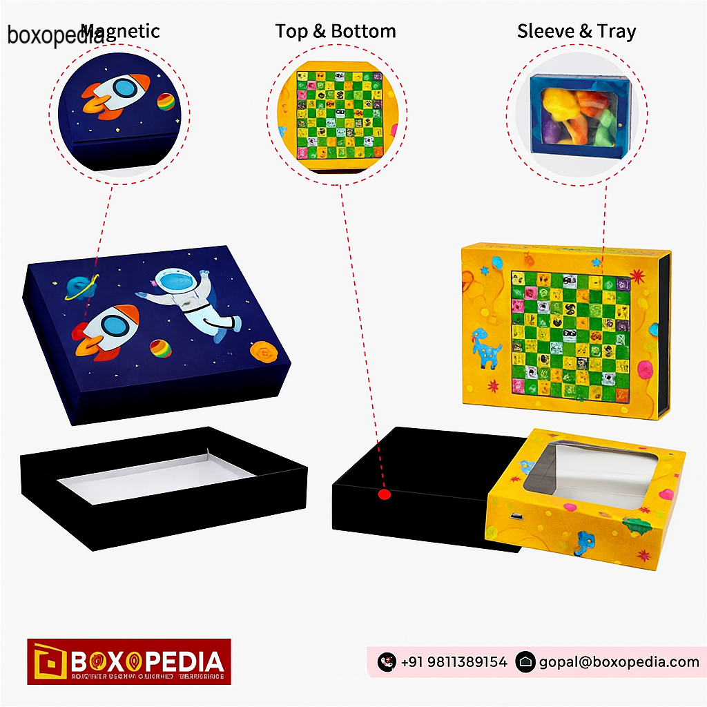 At Boxopedia Pvt Ltd, we design fun, durable, and engaging Games & Toys Boxes that capture the imagination of both children and parents. Crafted with sturdy, eco-friendly boards, these boxes are built to protect delicate toys, puzzles, and games while maintaining a playful and vibrant appeal. Our designs feature bright, attractive printing and creative graphics that reflect the excitement inside, making products more eye-catching on store shelves. We also offer customized compartments or inserts to ensure that every piece is safely stored and organized. Whether it’s board games, puzzles, action figures, or educational toys, our packaging is built to handle frequent use while still looking fresh and inviting. With advanced finishing options like matte, gloss, UV coating, or embossing, your toy brand gains a premium edge. Boxopedia ensures that our toy boxes provide not just protection but also a fun-filled unboxing experience for kids and families alike.